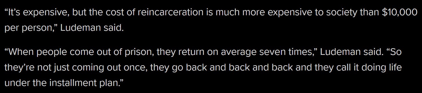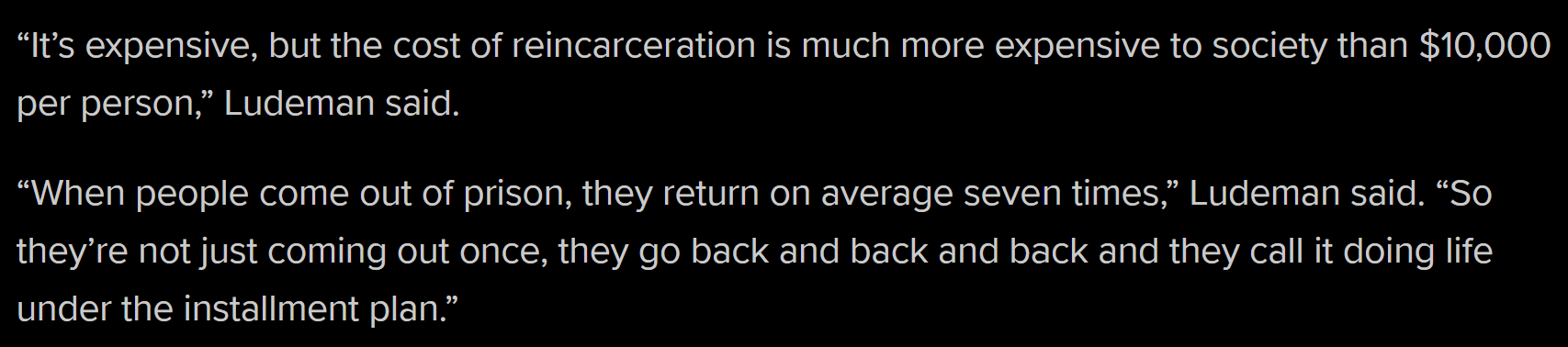 It costs a lot of money to keep a criminal in prison, and there are plenty of people making money on various forms of rehabilitation. That’s the short answer.